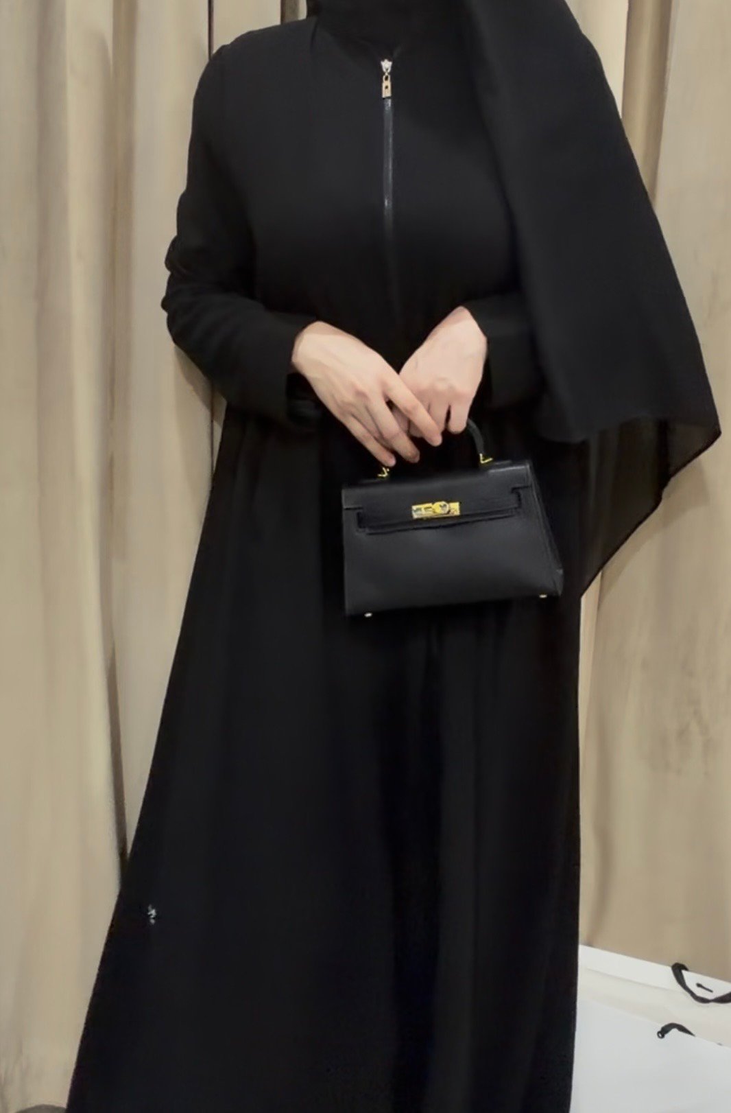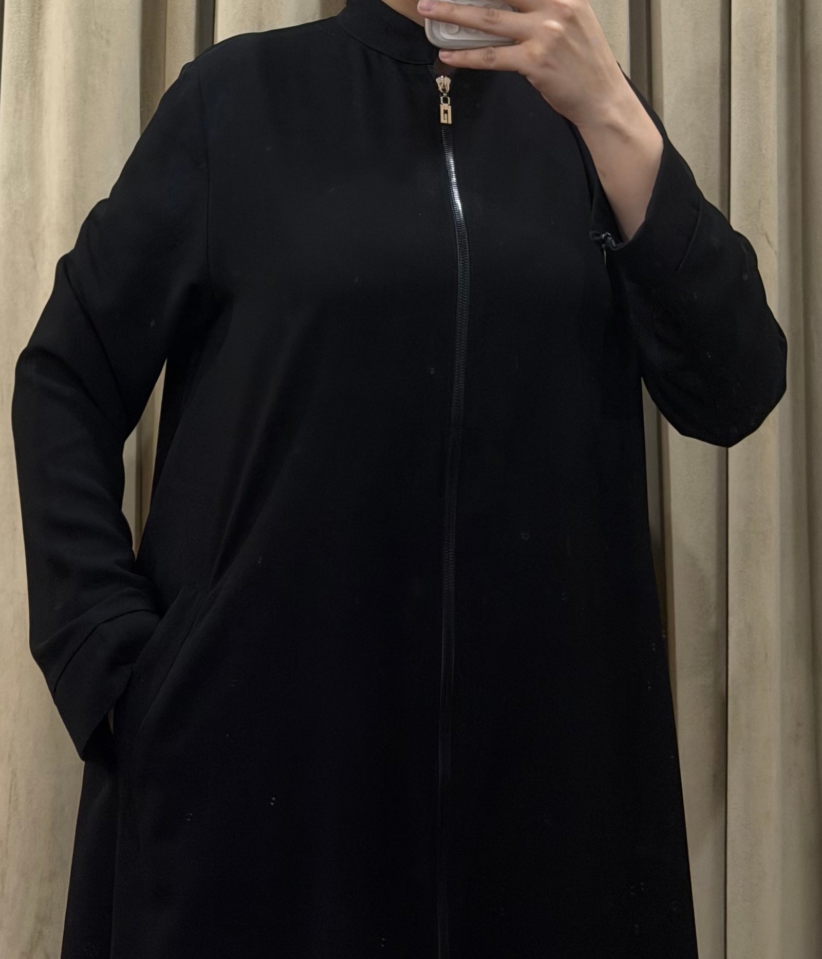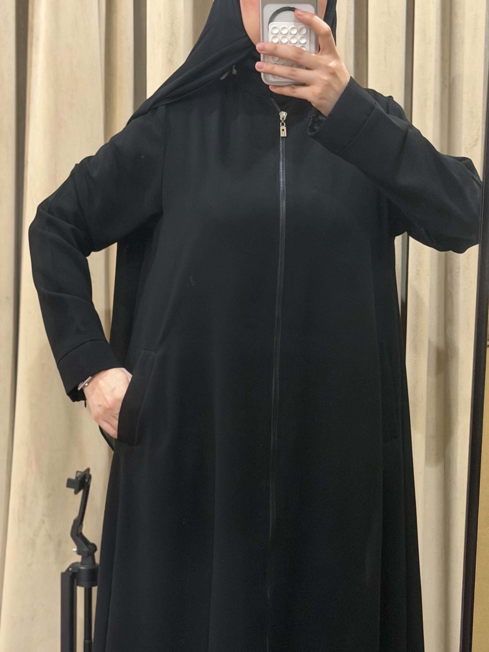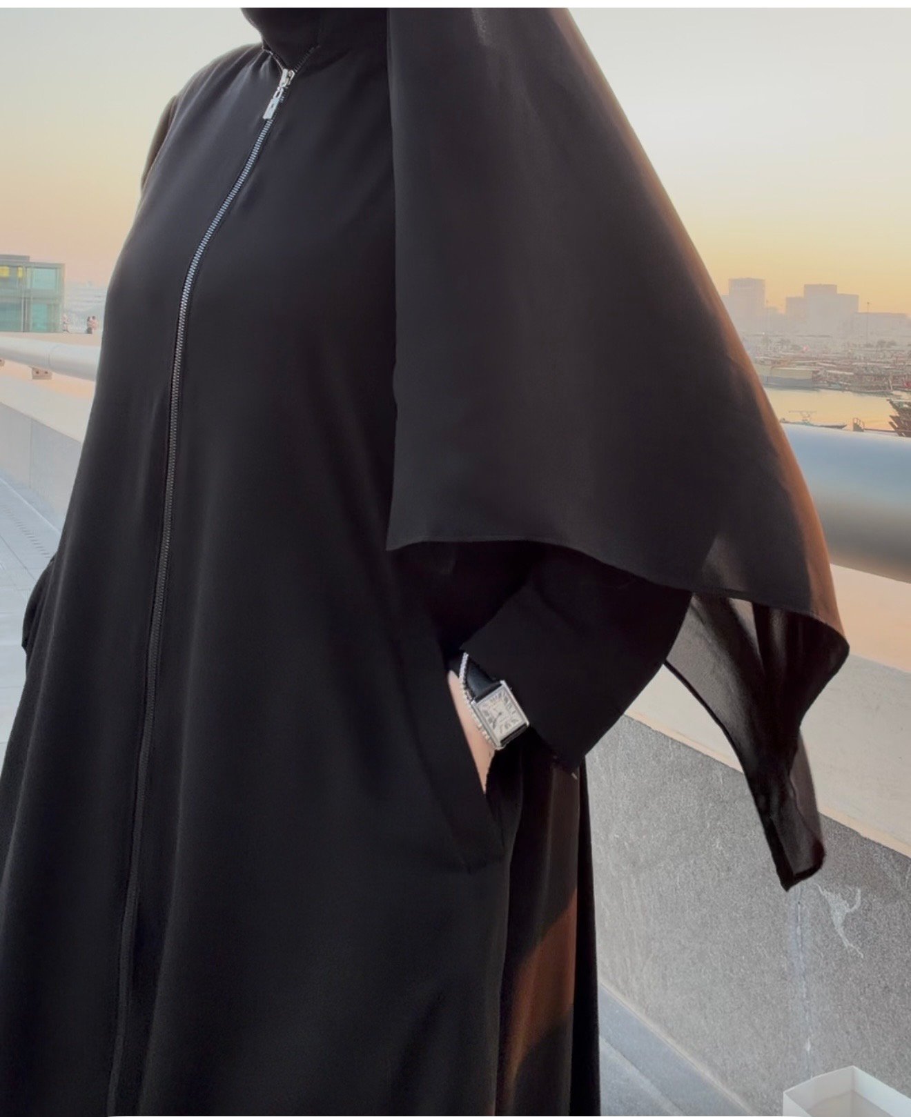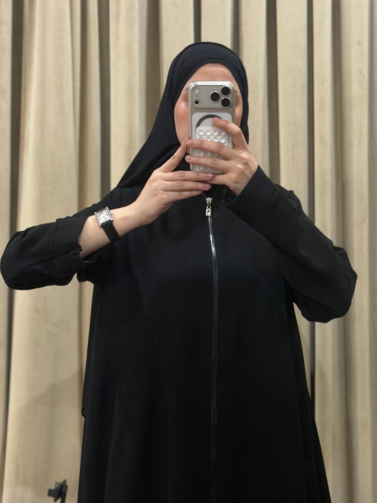 عبايه بتصميم انيق وبسيط مناسبه للعمره والحج والخروجات اليومية قصتها كلوش بها سوسته إماميه وسوسته بالأكمام لسهوله الوضوء خامتها كريب ملكي سواد فاحم